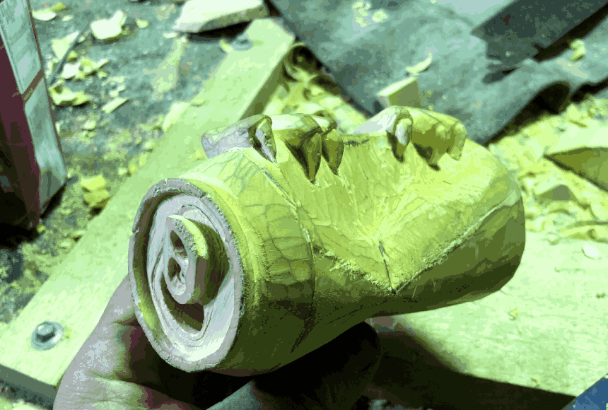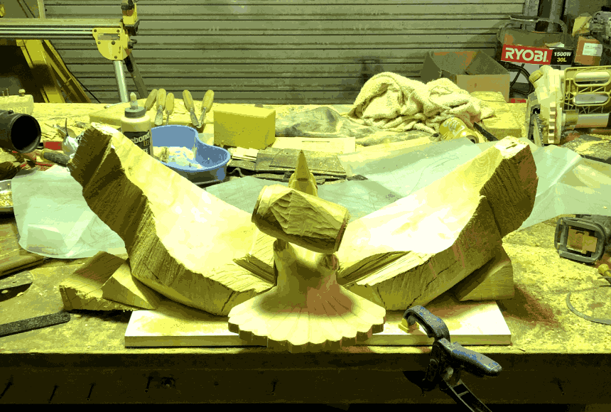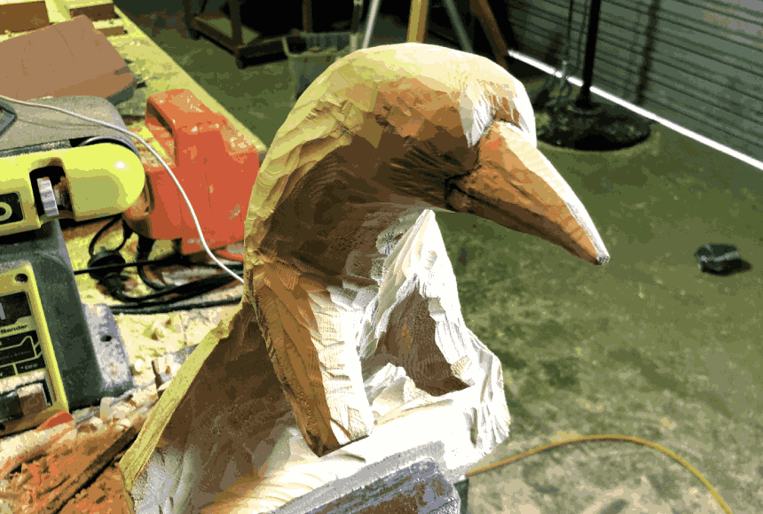 the entire bird is carved from wood.