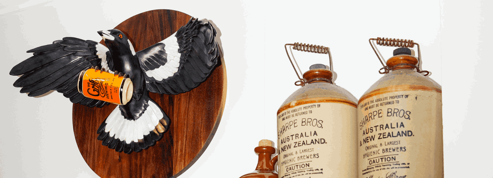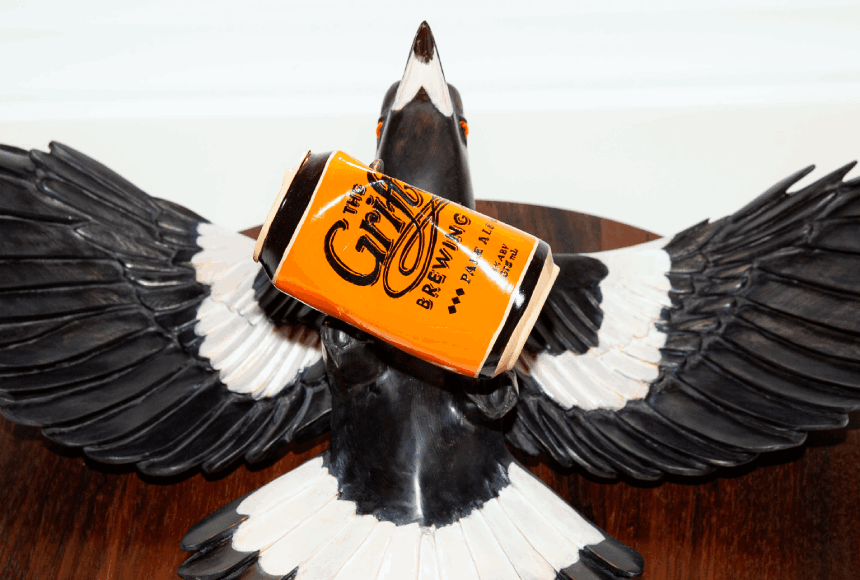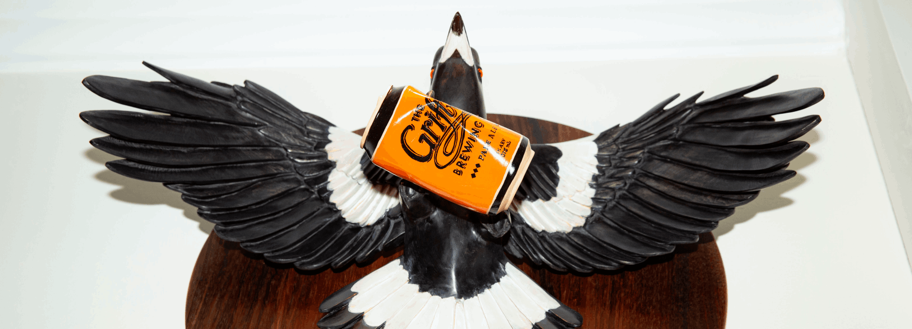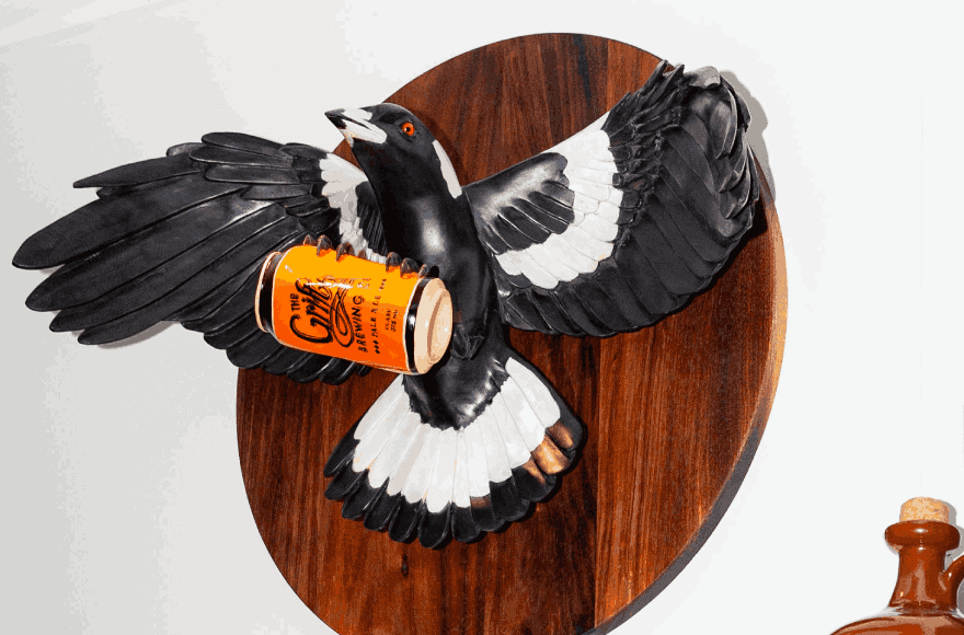 Finally, it isn’t the Pale can alone that makes this work distinctly Grifter. ‘I love the amount of bird action in the Grifter beer graphics, which was a strong visual reference for the spread-winged swoop of the magpie. The decision to make a circular backboard was also inspired by a beer coaster; the brand has a great aesthetic, besides the tasty brews!’