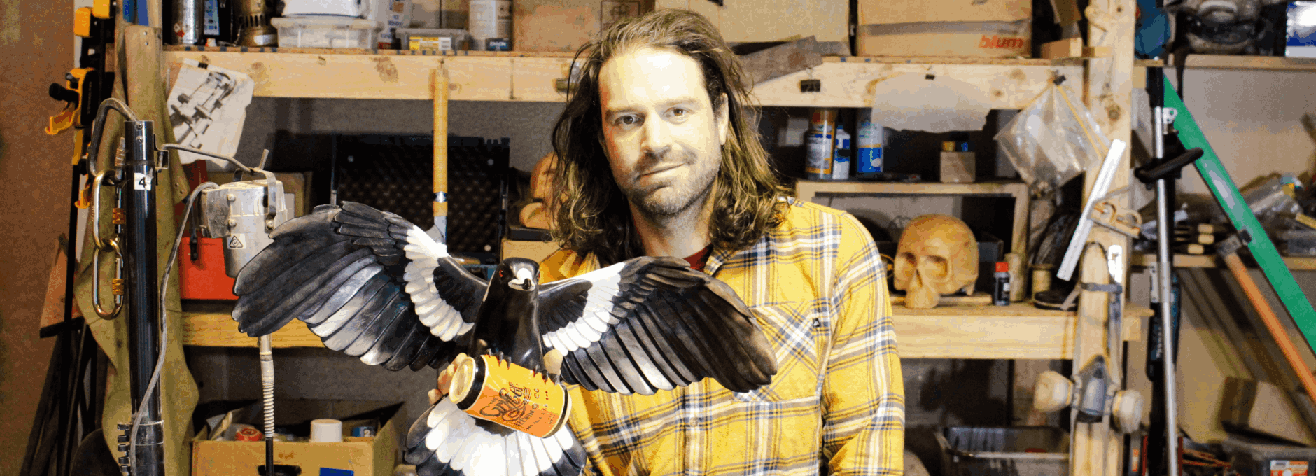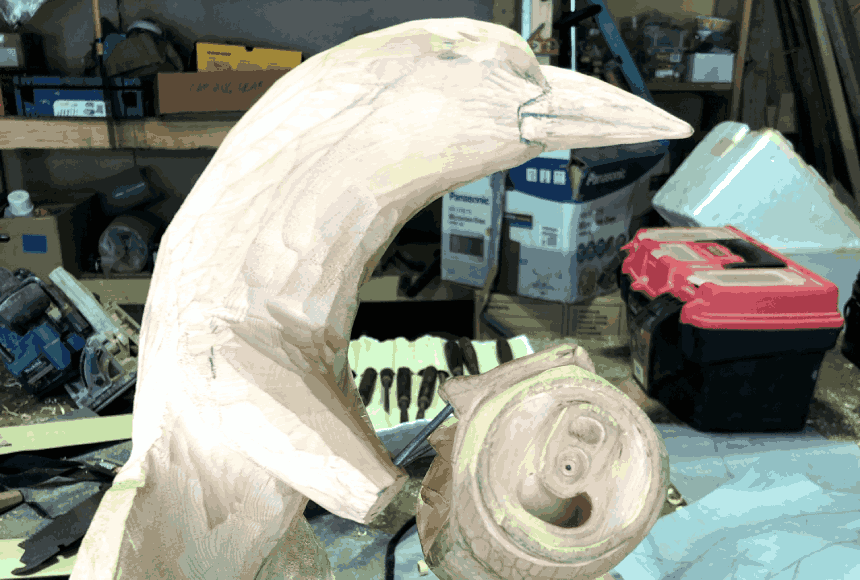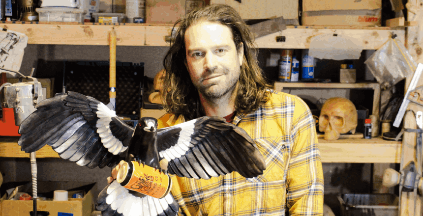 Now fiercely protected, huon pine is one of the oldest living organisms on earth. Individuals can survive up to 3000 years, and clusters cloning from the same original tree can survive over 10,000 years. Even the block the magpie sculpture comes from would’ve been cut down around 150 years ago, Mooney estimates. This age is what gives the wood its distinctive grain, visible in the magpie on the top of the can it clutches: ‘I've made pieces before where in an area the size of a 20 cent coin, you can see 200-odd growth rings.’